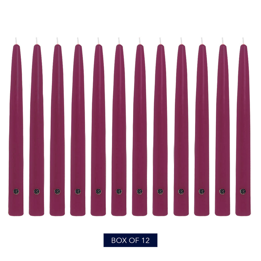 Our rich purple-red eight-inch Mulberry taper candles are hand dipped, with a virtually drip-free burn time of up to eight hours each.