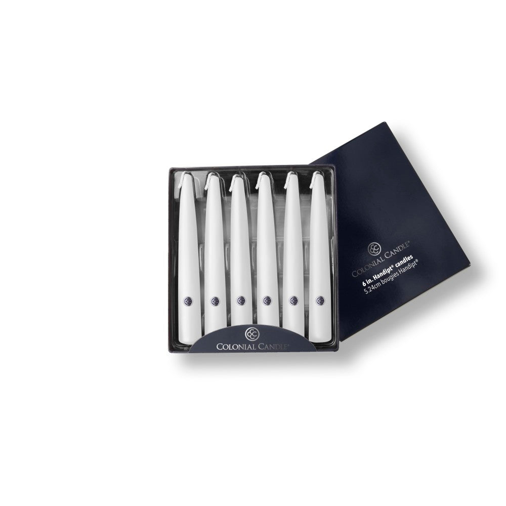 Our richly-colored and elegant unscented six-inch White taper candles are hand dipped, with a burn time of up to four hours each.
