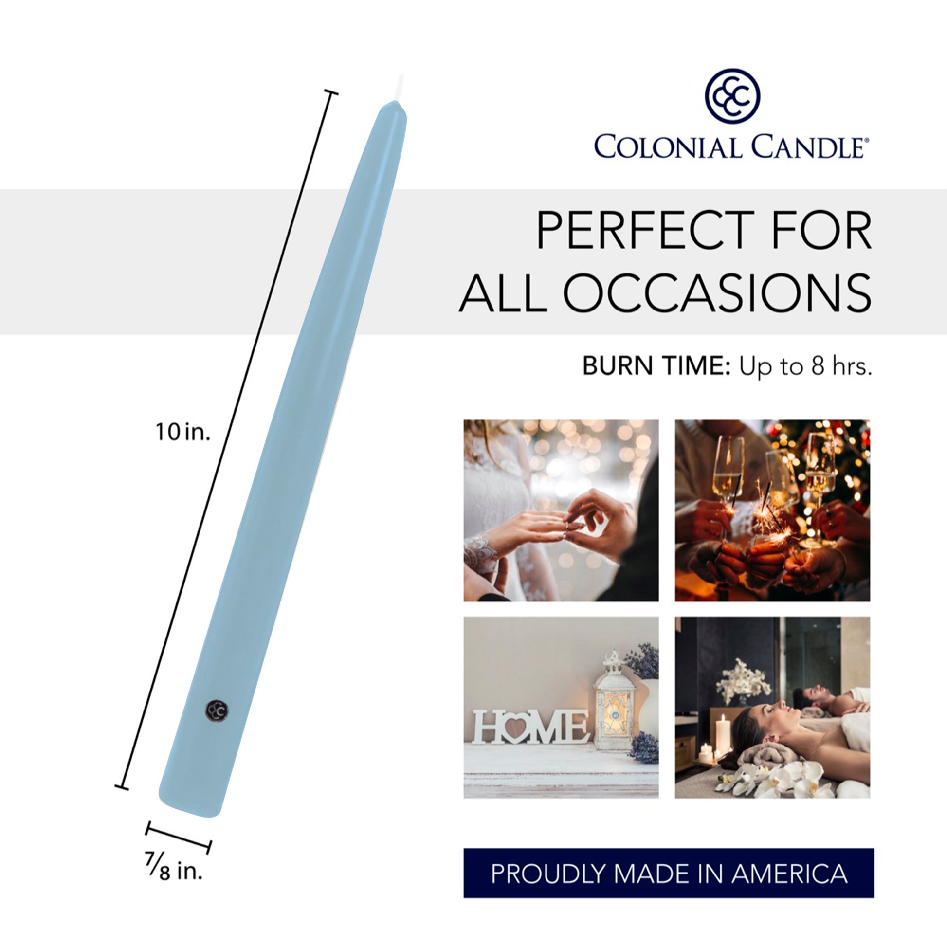 A refined and rich blue, our unscented Wedgewood taper candles bring a breath of fresh air to your home décor. These ten-inch candles are hand dipped, virtually drip free, and have a burn time of up to eight hours each.