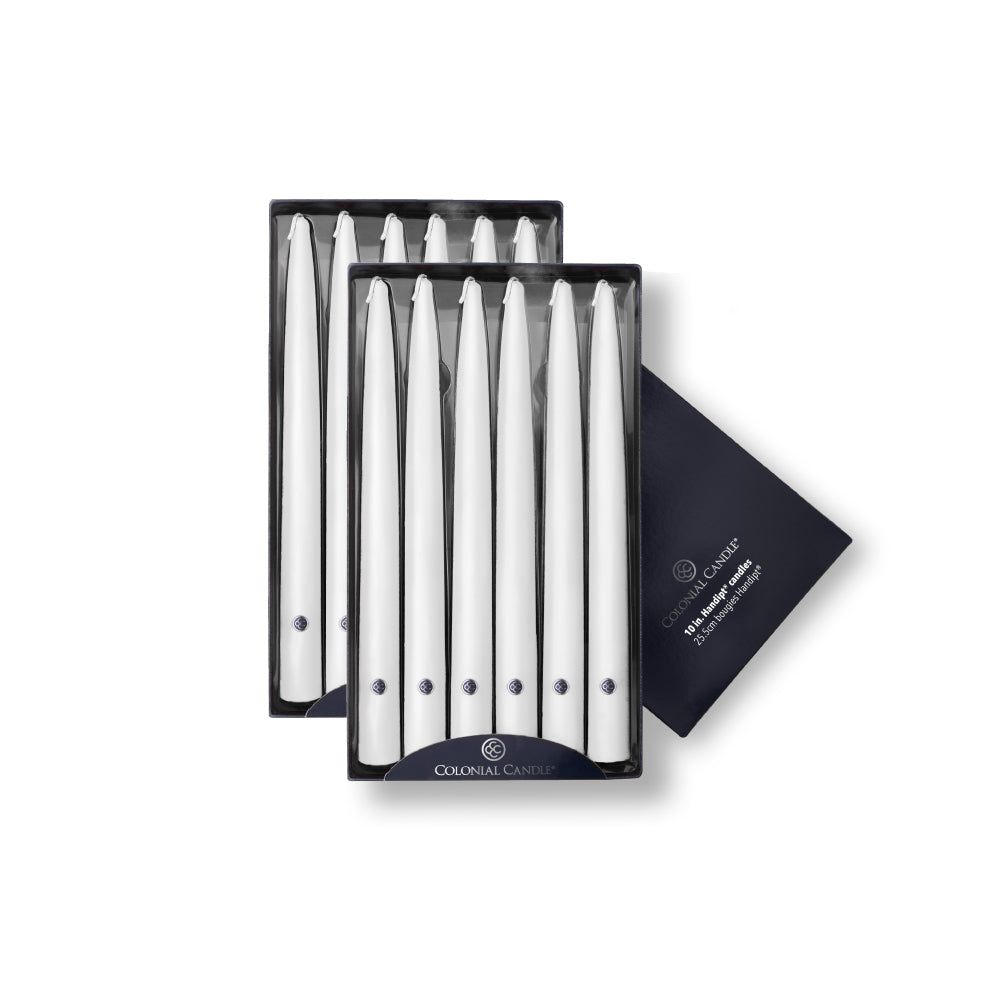 With elegant simplicity, our unscented White taper candles bring a soothing touch to your home décor. These ten-inch candles are hand dipped, virtually drip free, and have a burn time of up to eight hours each.