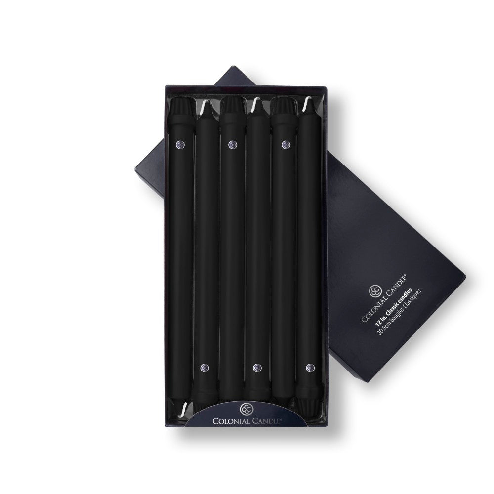 A boldly elegant color, our unscented Black taper candles bring a breath of fresh air to your home décor. These twelve-inch candles have a bevelledbase to provide stability and support needed for most taper holders, are virtually drip free, and have a burn time of up to ten hours each.