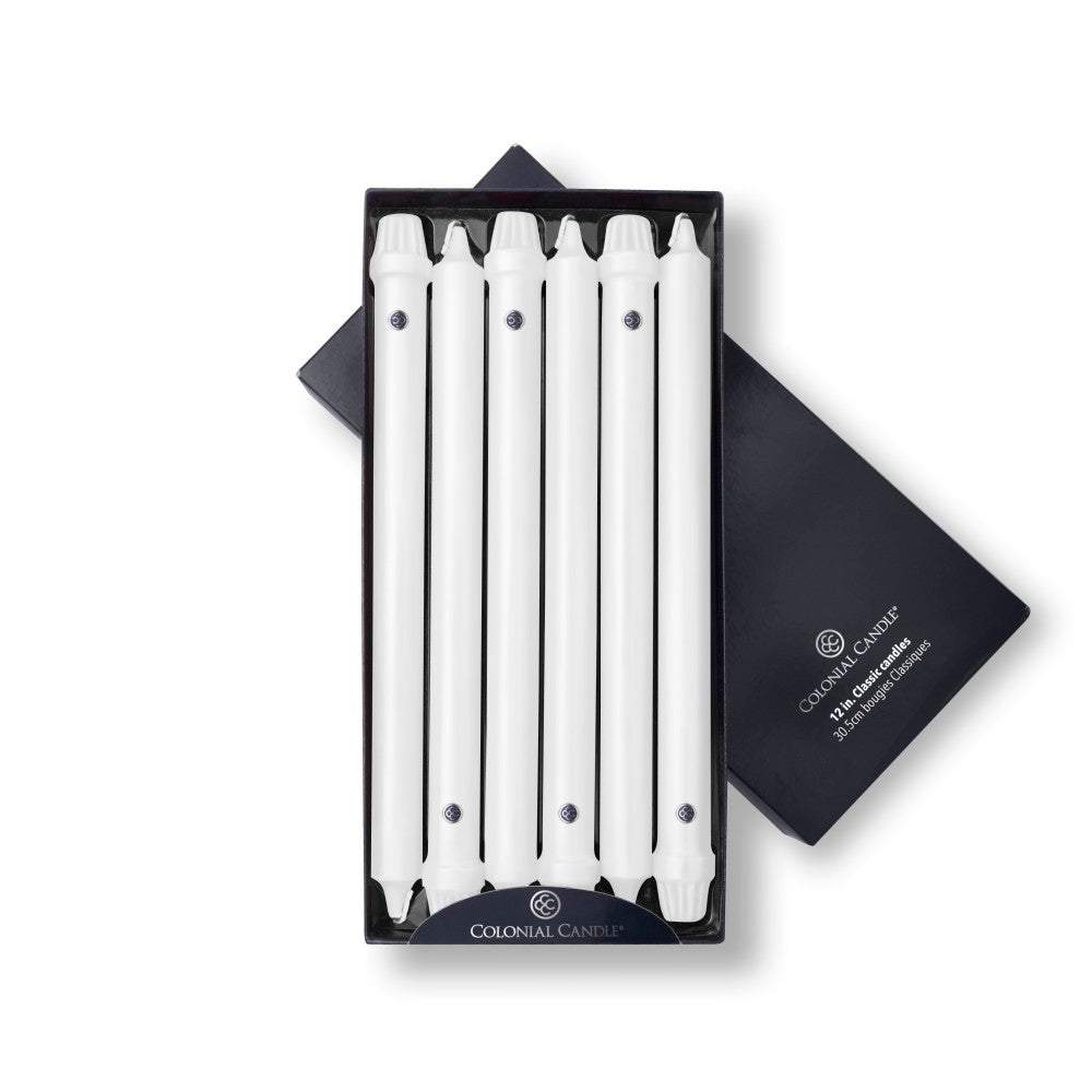 An elegant and sophisticated color, our White taper candles bring a breath of fresh air to your home décor. These twelve-inch candles have a bevelledbase to provide stability and support needed for most taper holders, are virtually drip free, and have a burn time of up to ten hours each.