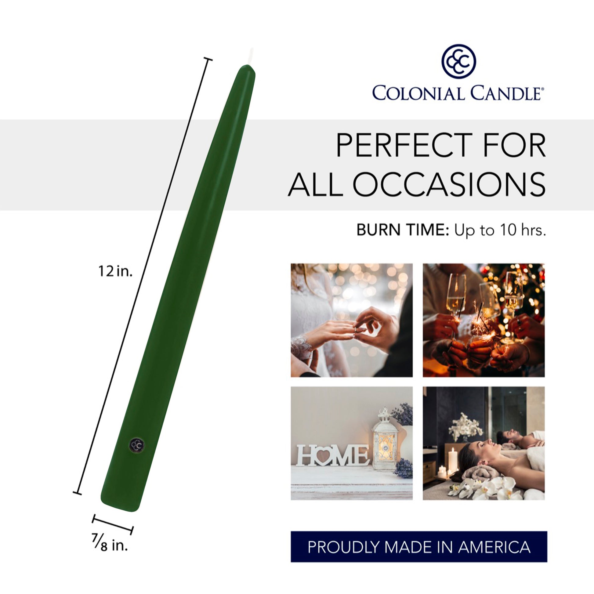 A deep green color, our Evergreen taper candles bring a bold touch to your home décor. These twelve-inch candles are hand dipped for a nostalgic look, virtually drip free, and have a burn time of up to ten hours each.