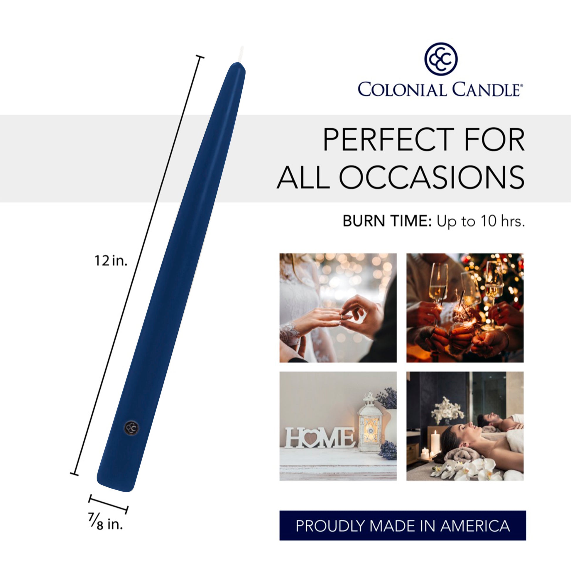 A boldly elegant color, our unscented Indigo taper candles bring a glow to your home décor. These twelve-inch candles are hand dipped, virtually drip free, and have a burn time of up to ten hours each.