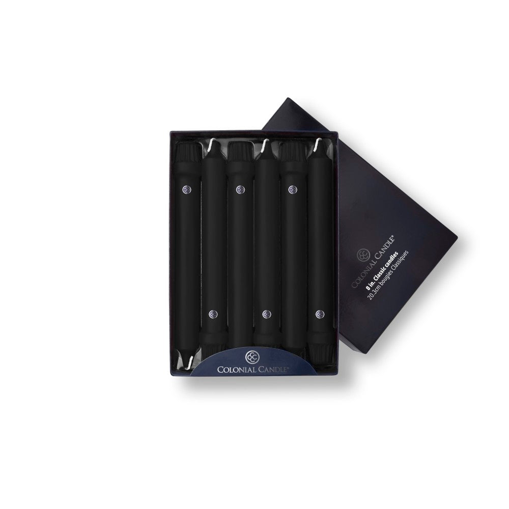 - Our dramatic and glamorous eight-inch unscented Black classic taper candles have a virtually drip-free burn time of up to six hours each.
