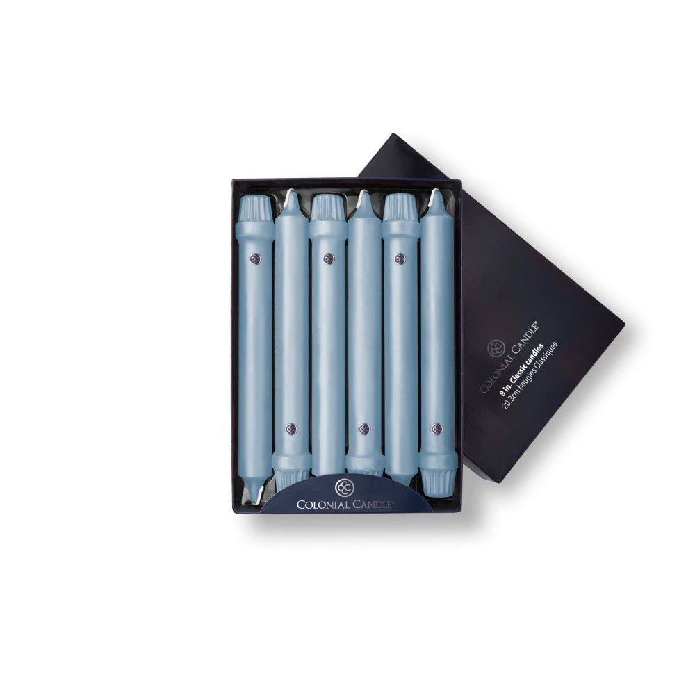 A soothing neutral color, our unscented Coastal Blue taper candles bring a breath of fresh air to your home décor. These eight-inch candles have a bevelledbase to provide stability and support needed for most taper holders, are virtually drip free, and have a burn time of up to six hours each.