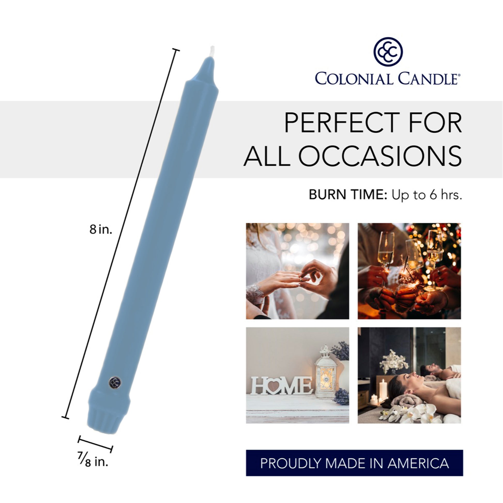 A refined and rich blue, our unscented Wedgewood taper candles bring a glow to your home décor. These eight-inch candles have a bevelledbase to provide stability and support needed for most taper holders, are virtually drip free, and have a burn time of up to six hours each.